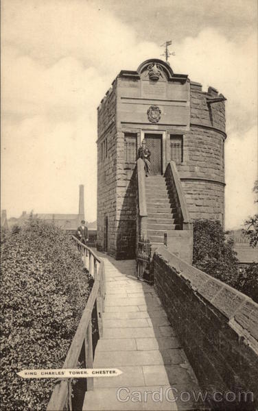 Front: KING CHARLES' TOWER. CHESTER. Back: POSTCARD. Ꭺ Ꭱ Ꭰ THIS SPACE MAY BE USED FOR INLAND COMMUNICATION POST CARD RATE, AND FOR FOREIGN AT LETTER RATE. "The Cestrian" Series (Copyright), Published at Huke's Library, Chester, ½/2₂d. STAMP.