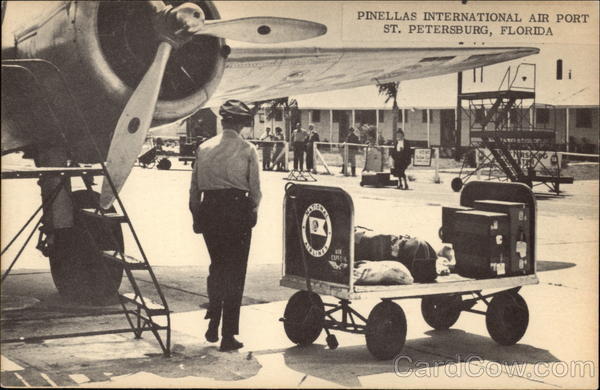 Front: PINELLAS INTERNATIONAL AIR PORT ST. PETERSBURG, FLORIDA TRSPOPG OFES Back: LITHO. BY HARTMAN CARD CO., LARGO, FLA.