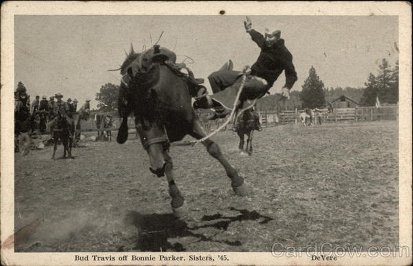 Front: Bud Travis off Bonnie Parker. Sisters, '45. De Vere Back: DeV-41 A ‘Natural-Finish' Card Made by Graycraft Cúrd Co., Danville, Va. De Vere Helfrich, P. O, Box 815, Klamath Falls, Oregon