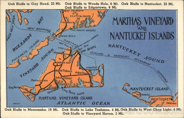 Oak Bluffs to Gay Head, 23 Mi. Oak Bluffs to Woods Hole, 6 Mi. Oak Bluffs to Nantucket, 25 Mi.