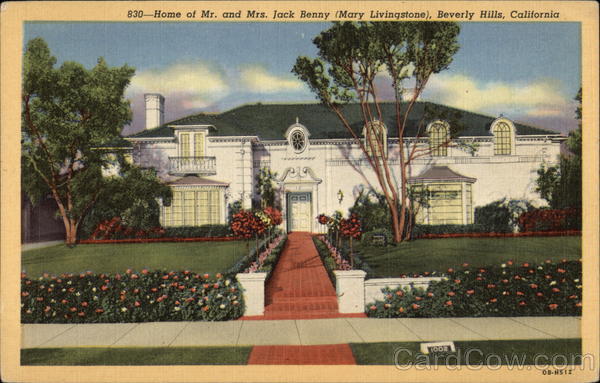 Front: 830-Home of Mr. and Mrs. Jack Benny (Mary Livingstone), Beverly Hills, California 1002 OB-H512 Back: WESTERN PUBLISHING & NOVELTY CO., LOS ANGELES, CALIF. more star home C.T.ART-COLORTONE' REG. U.S. PAT. OFF.
