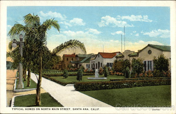Front: EILS TYPICAL HOMES ON NORTH MAIN STREET, SANTA ANA, CALIF. Be 105748 Back: MADE IN USA PUBLISHED BY ve Ston SANTA ANA, CALIF. din p C. T. AMERICAN ART COLORED 19 22506 HERE