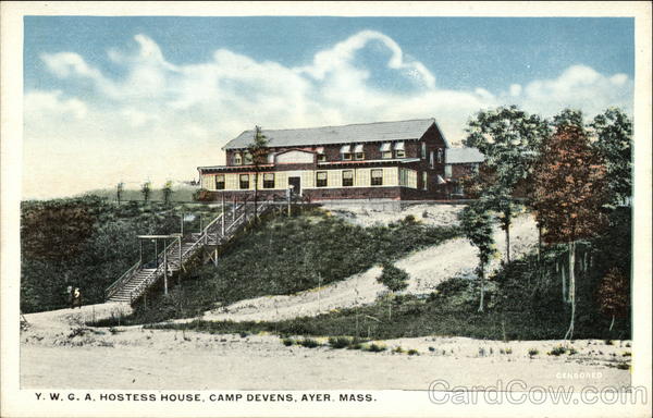 Front: Y. W. G. A, HOSTESS HOUSE, CAMP DEVENS, AYER. MASS. CENSORED Back: Mfg. by Ticbnor Bros. Inc., Boston, Mass. For Artiny Y. M. C. A., Camp Devens, Ayer, Mass. 3. YMCA THIS SPACE FOR ADDRESS ONLY