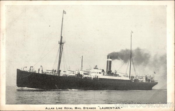 Front: 20 ALLAN LINE ROYAL MAIL STEAMER "LAURENTIAN." मेल Back: This space may be used for communication for Inland Postage only, not Foreign. Maclure, Macdonald & Co., Glasgow. HALFPENNY HERE.
