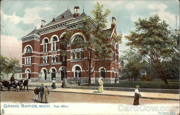 Front: 4344444 GRAND RAPIDS, MICH. Post Office. The Boston Store. Printed in Germany. Back: Raphael Tuck & Sons' Post Card Series No 2085 "Grand Rapids, Mich." ART PUBLISHERS TO THEIR MAJESTIES THE KING AND QUEEN. ARTISTIC POST CARD.