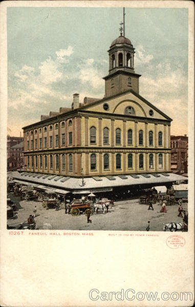 Front: CONCIVERSALLE 10267. FANEUIL HALL. BOSTON, MASS. BED BUILT IN 1742 BY PETER FANEUIL. COPYRIGHT 1905. BY DETROIT PUBLISHING CO. Back: 50 AND CANADA. FOREIGN. TWO CENTS