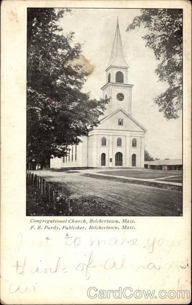 Front: Congregational Church, Belchertown, Mass. F. B. Purdy, Publisher, Belchertown, Mass. to make think of Alma avi and Back: 9.0 RF D Šv Miss Florence at Ba cheltour SERIES 1902 TATES OF OR AMERICA Tips! 1706 FRANKLIN 1790 MASS Mass CO