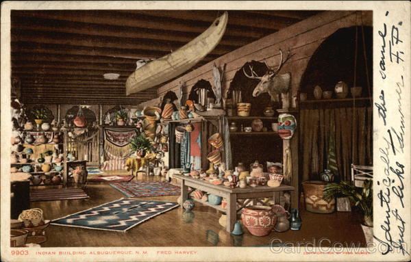 Front: Al VIRE 9903. INDIAN BUILDING. ALBUQUERQUE, N. M. FRED HARVEY. COPYRIGHT. 1906. BY FRED HARVEY. the same dit my fust Back: 1909 RP.U. ORK UNITED S TES OF Lups AMERICA qui 1706 FRANKLIN 1790 Wist F. Kingsley 88 Belmont Loversville. Il vi