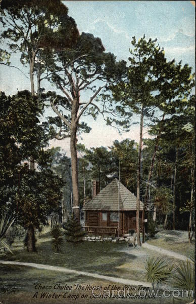 Front: "Chaco Chulee "The House of the Pine Tree A Winter Camp on Santa Lucia Plantation Back: THE HUGH C. LEIGHTON CO., MANUFACTURERS. PORTLAND, ME., U.S.A. One Cent for United States, and Island Possessions, Cuba, Canada and For Foreign.