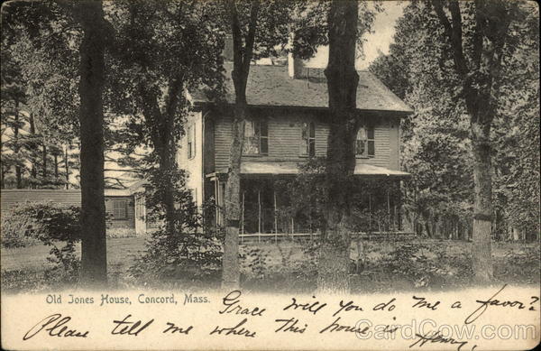 Front: Old Jones House, Concord, Mass. Grace will you do Please tell me where this house is favor? me a Henry, Back: No. 2770, The Rotograph Co., N. Y. City. (Germany.) 4- ORD. AUG 24 8. PM 1909 Show Mass. Ma Miss Grace L. Hunt ONE CEN