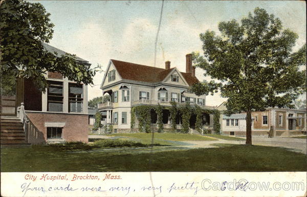 Front: City Hospital, Brockton, Mass. Your cards ·ards were very, very pretty. E.M. Back: The Metropolitan News Co., Boston, Mass. Manufacturers of Souvenir Postal Cards. No. 6979. TWO CENTS