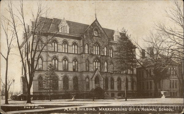 Front: Fred F.Miller. AL HII MAIN BUILDING, WARRENSBURG STATE NORMAL SCHOOL. Back: UNITED ART PUBLISHING CO., NEW YORK CITY ny? POST CARD