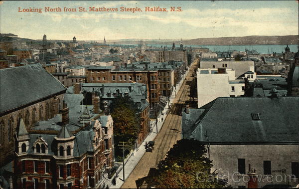 Front: Looking North from St. Matthews Steeple, Halifax, N.S. TI 11 JE HTT noses D Back: Montreal and Toronto The Valentine & Sons Publishing Co., Ltd. FAMOUS VA& SONS CARD THROUGHOUT THE WORLD BRITISH MANUFACTURE