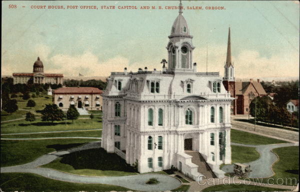 508 - COURT HOUSE, POST OFFICE, STATE CAPITOL AND M. E. CHURCH, SALEM, OREGON.