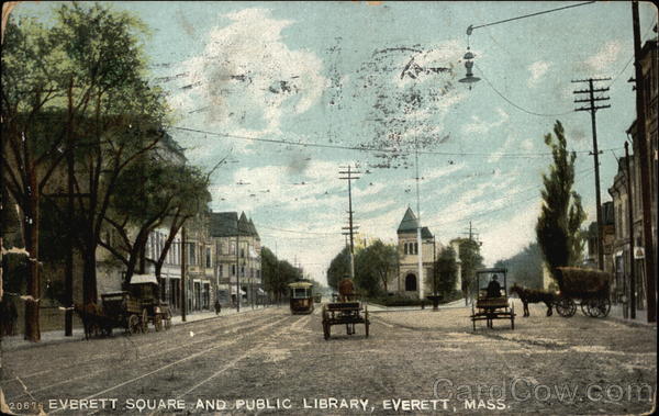 Front: ****** 20678 EVERETT SQUARE AND PUBLIC LIBRARY, EVERETT, MASS. Back: 354 391 Postord 12 9+3UA The MASS 69 19 ESSEX STREET 09/ WritOTATION da 13 I am here all alone MissLouie Lane No Hampton NA. 3.00 U.S.POSTAGE