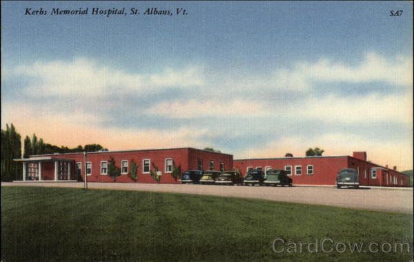 Front: Kerbs Memorial Hospital, St. Albans, Vt. SA7 96 8 Back: 87391 "TICHNOR QUALITY VIEWS” REG. U. S. PAT. OFF. MADE ONLY BY TICHNOR BROS., INC., BOSTON, MASS. PUB. BY THE RIVERSIDE PAPER CO., BURLINGTON, VERMONT