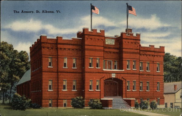 Front: The Armory, St. Albans, Vt. V. N.C. Back: MADE IN U. S. A DOST CARD *TICHNOR QUALITY VIEWS" REG. U.S. PAT, OFF. MADE ONLY BY TICHNOR BROS., INC., BOSTON, MASS. 74421 PUB. BY RIVERSIDE PAPER CO., BURLINGTON, VT.