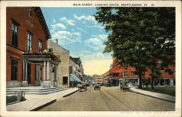 Front: 31. MAIN STREET, LOOKING SOUTH. BRATTLEBORO, VT. TOWN HALL Back: 493 A-63061 AND ISLAND POSSESSIONS, CUBA, CANADA AND MEXICO PUBLISHED BY CHAS. W. HUGHES, MECHANICVILLE, N. Y. C.T. AMERICAN Z - STAR PUALITY co