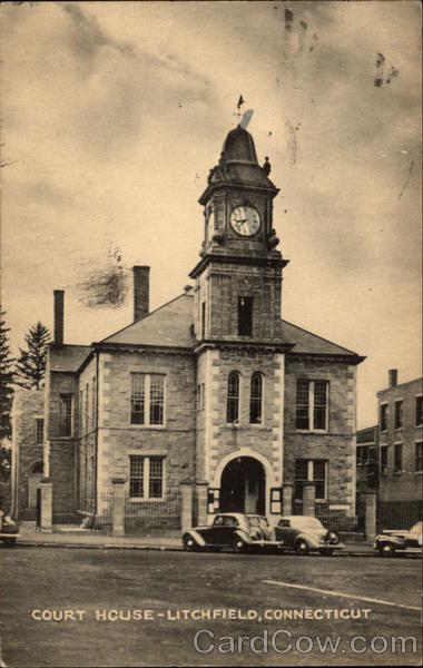 Front: COURT HCUSE-LITCHFIELD, CONNECTICUT Back: EHFIE POST GE AUG 15 0 ki PM 3 REMEMBER MR H. Gheory CEN 212 DEWEY ST. BrzIDGEPORT Cond. مگر Published for Edward Wells, Dumont, N. J. by The Collotype Co., Elizabeth, N.J. and N.Y. 53