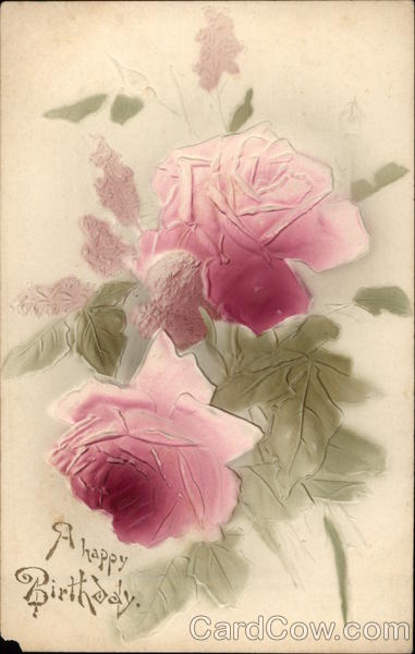 Front: A happy Birthday. Back: Me THIS SPACE MAY BE USED FOR COMMUNICATION Miss Elebeth Mergeboss and Bell Peptos