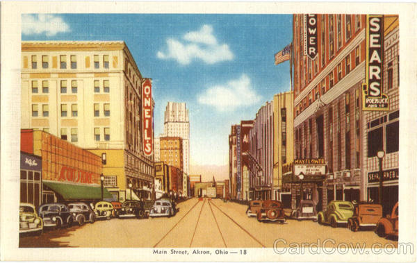 Front: POEBUCK AND CO MAYFLOWER SEAR, RDEB Main Street, Akron, Ohio 18 SEARS 03ER ONEILS Back: Miller Mdse. Co., Akron, Ohio, Publisher 26503 Colorcraft-Made by The Dexter Press, Pearl River, N. Y. Hayden SAMP ONE QENT Sarah