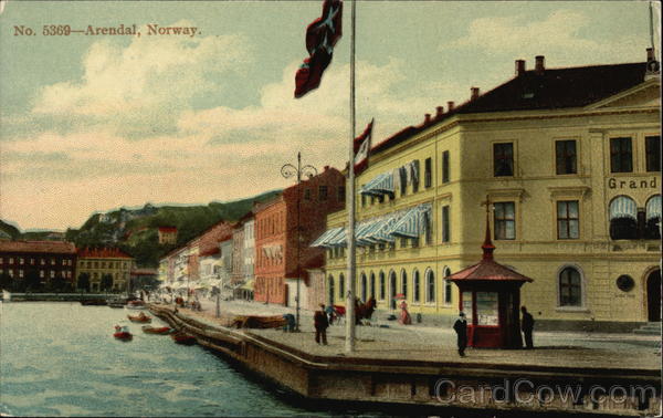 Front: No. 5369-Arendal, Norway. CH da Grand Grend w Back: Published by Fredrik Peterson, Tremont Temple, Boston, Mass. μlost Most Card This space may be used for communication. One cent stamp Canada and Two cent stamp for all other countries.
