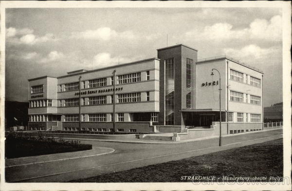 Front: C5AP8R4 ய ர A5ARTEDVS நகும்பா மா DIVEI STRAKONICE - Masarykovy obecne skoly. Back: Knihy-papír J. Jonáš, Strakonice. Tel. 303, 198