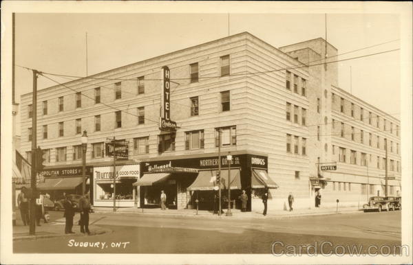 Front: OPOLITAN STORES SE WANDE Murray GOOD FOOD SUDBURY, ONT Coulson Hallwood HOTEL COULSONE HOTEL COULSON NORTHER DR G NORTHE Om CO. RUGS DRUGS DRUGS HOTEL Back: Mon MADE IN CANADA 17, 1939 Joly 17 AZO." A PLACE A