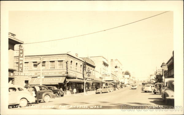 Front: RECREATION FRY BRUG CO. PR DRUG CO. FILTON WELERS WATCHES W20 STREET SCENE PORT-ANGELES, WASH weber Back: Thurs. July 31, 19.47 HERE