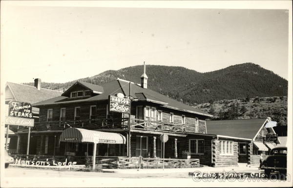Front: Famous STEAKS Cocktails HANSON'S Hanson's Lodac HANSON Lodge 378 NSON'S LODGE MIRSARA Teaho, springs, colo HANSON Lodge 424 358 Back: Aleg. 29. Kodak-> Paper 1