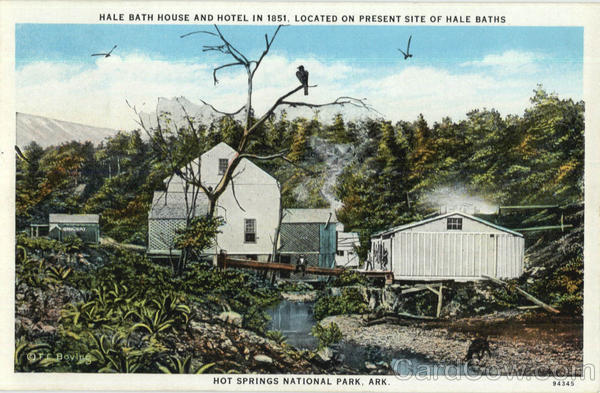 Front: HALE BATH HOUSE AND HOTEL IN 1851, LOCATED ON PRESENT SITE OF HALE BATHS GROCERY OFC Boving HOT SPRINGS NATIONAL PARK, ARK. 94345 Back: PUBLISHED BY F. C. BOVING, HOT SPRINGS NATIONAL PARK, ARK. c. 1. AMERICAN ART COLORED CAO