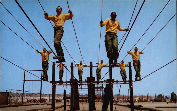 | The near-acrobatic agility of a tight-rope walker is required of the novice Marine as he maneuvers the "Engineers' Bridge", on the Conditioning Course which he must master while undergoing recruit training at the San Diego Marine Corps Recruit Depot |