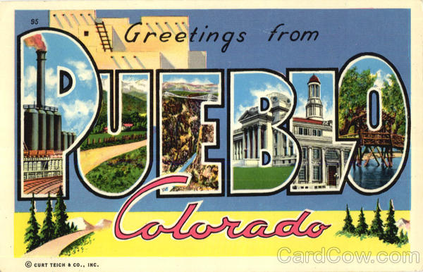 Front: 95 Greetings from Colorado CURT TEICH & co., INC. Back: DISTRIBUTED BY PUEBLO WHOLESALE SPECIALTY CO., BOX 1408, PUEBLO, COLO. CURTEICH COLORĀ® 3-D NATURAL COLOR REPRODUCTION (REG. U. S. A. PAT. OFF.) SDK.64