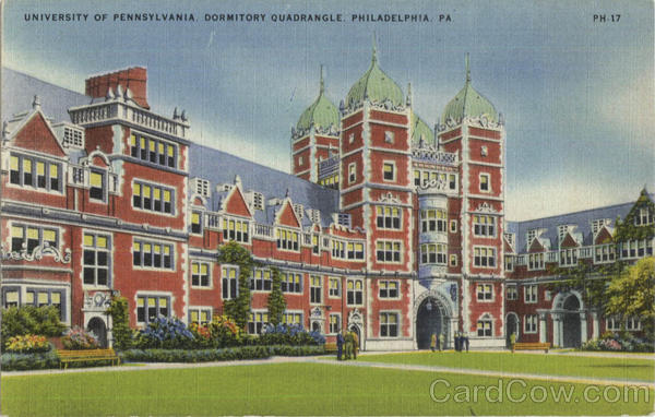 Front: UNIVERSITY OF PENNSYLVANIA. DORMITORY QUADRANGLE, PHILADELPHIA, PA PH 17 Back: 2- 14246 PHILADELPHIA, PA. 9h SOLD BY THE CENTRAL NEWS CO. COLOURPICTURE'. PUBLICATION, CAMBRIDGE, MASS., U. S. A.