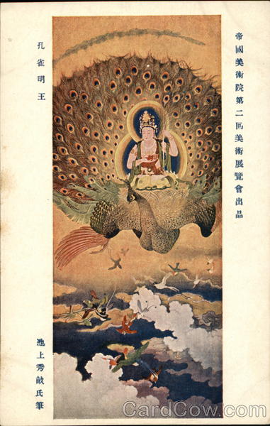 Front: 帝國美術院第二回美術展覽會出品 孔雀明王 300 池上秀畝氏筆 Back: UNION POSTALE UNIVERSELLE. 行發會藝工術美四四/登時代美田神) ELEMEN MADE IN JAPAN MOVIMENTONG 22 きかは便郵