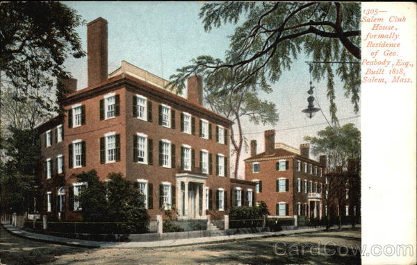 Front: 11 16 1305- Salem Club House, formally Residence of Geo. Peabody, Esq., Built 1818, Salem, Mass. Back: I have a few like card I think that you would Mr. Prank Ffordan 384 Washington Ir St Poeton Mass. 3