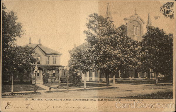 Front: JOHNT COVENTRY Easter Gree ST. ROSE CHURCH AND PAROCHIAL RESIDENCE, LIMA, N.Y. in 19 Lv ******* V 2 22. C. Back: LIMA APR 730AM 1903 SERIES 1902 UNITED STATES OF 1706 FRANKLIN 1790 Press R. H. Don Miss Gen St Clair Street ne neva J.