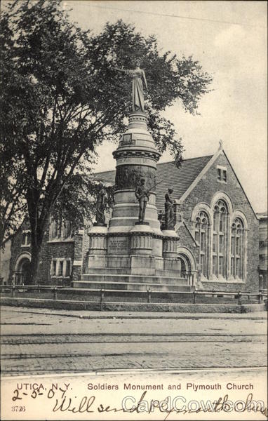 Front: 3726 RE KEEP WHO DE FLAG ODE LA UTICA, NY. Soldiers Monument and Plymouth Church Will send Plymouth chunus Back: A. J. Purvis, Utica, N. Y. PEK Howard Reigle. Auskony fathe. M.J. This side for the address