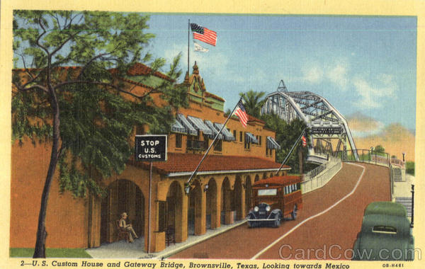 Front: STOP CUSTOMS ATINE 2-U. S. Custom House and Gateway Bridge, Brownsville, Texas, Looking towards Mexico OB-H461 Back: C AND H DISTRIBUTORS, HARLINGEN, TEXAS AMERICA'S BEST GRAPEFRUIT AND ORANGES GROW IN TEXAS VALLEY-GATEWAY TO MEXICO