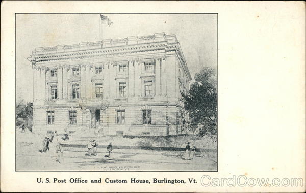 Front: CO AS POST OFFICE AND CUSTOM BASE BVRLINGTON, VT. U.S. Post Office and Custom House, Burlington, Vt. Back: 00 00 TWO CENTS