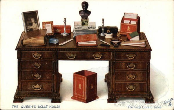 Upon the King's writing table in the library of the Queen's Dolls' House is a handsome silver inkstand on the lines of that used by His Majesty. Pens, paperweights, reference books. a "Raphael Tuck" calendar, a cheque book - all that is needed for correspondence is set out, not forgetting a wastepaper basket |