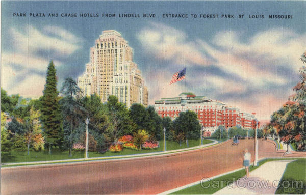 PARK PLAZA AND CHASE HOTELS FROM LINDELL BLVD ENTRANCE TO FOREST PARK. ST LOUIS. MISSOURI