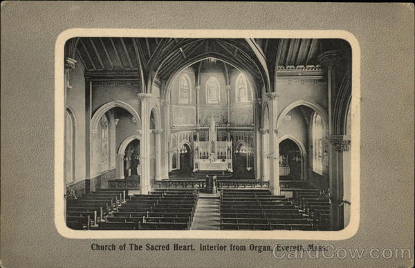 Front: శ్రీకరం Church of The Sacred Heart. Interior from Organ, Everett, Mass. Back: Pub. by The German American Post Card Co.. Boston, Mass. No. 2081. Printed in Germany. Dost Card. For Correspondence. 141