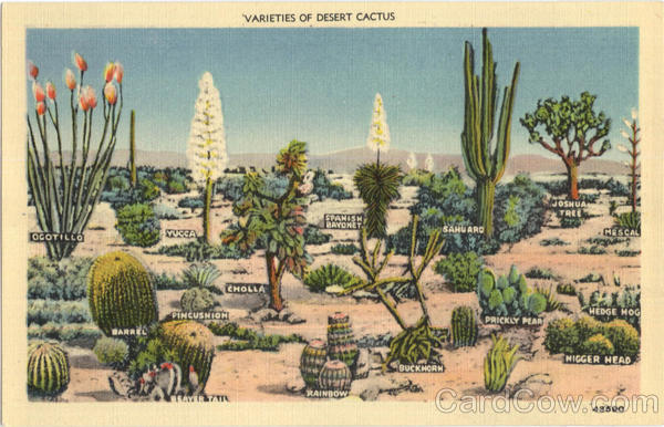 Front: 'VARIETIES OF DESERT CACTUS OSHUA TREE SPANISH BAYONET YUCCA SAHUARO MESCAL OGOTILLO CHOLLA HEDGE HOG PINCUSHION PRICKLY PEAR BARA NIGGER HEAD BUCKHORN RAINBOW 43590 Back: 435 90 PUB. BY SAN ANTONIO CARD CO.. SAN ANTONIO TEXAS DUĆ Z MOD3