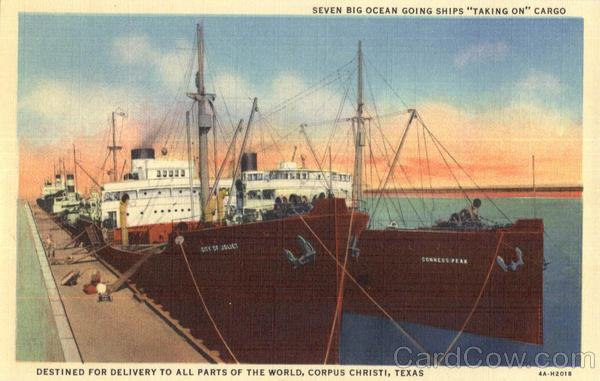 SEVEN BIG OCEAN GOING SHIPS "TAKING ON" CARGO ITY OF JOLIET CONNESS PEAK DESTINED FOR DELIVERY TO ALL PARTS OF THE WORLD, CORPUS CHRISTI, TEXAS 4A-H2018