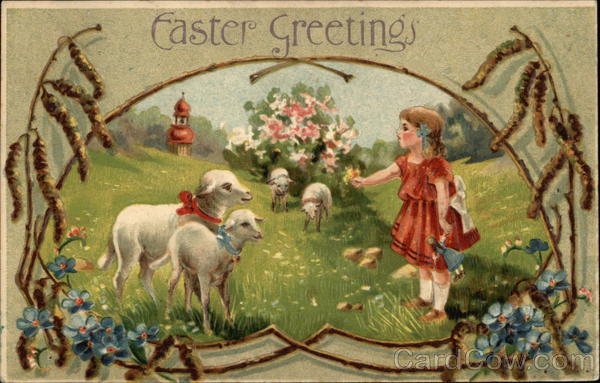 Front: Caster Greetings Back: Correspondenzkarte - Dopisnice ОТКРЫТОЕ ПИСЬМО.-Levelezö-Lap Alwine. To Hulda from Aunt Miss Hulda B. Meyer Dres Plaines: Route ! Illinois. of F. Meyer