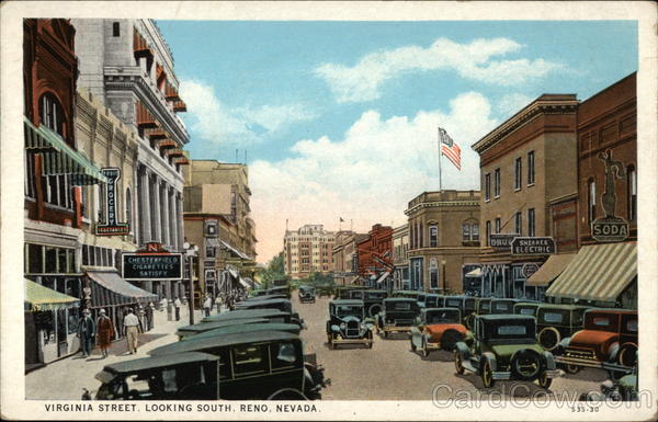 Front: IN CHESTERFIELD CIGARETTES SATISFY VIRGINIA STREET, LOOKING SOUTH, RENO, NEVADA. 99 100 DRU SHEARER SODA 535-30 Back: MADE BY CURT TEICH & CO., INC., CHICAGO, U.S.A. 69.⁹0€ HERE