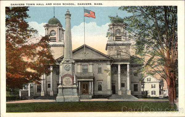 Front: DANVERS TOWN HALL AND HIGH SCHOOL, DANVERS, MASS. BELEID KHM Back: PUB. BY DANVERS SQUARE BOOK SHOP, DANVERS, MASS. MFD CAM BY 160 BRIES TICHNOR 121539. OHP 3" MASS THIS SPACE FOR ADDRESS ONLY