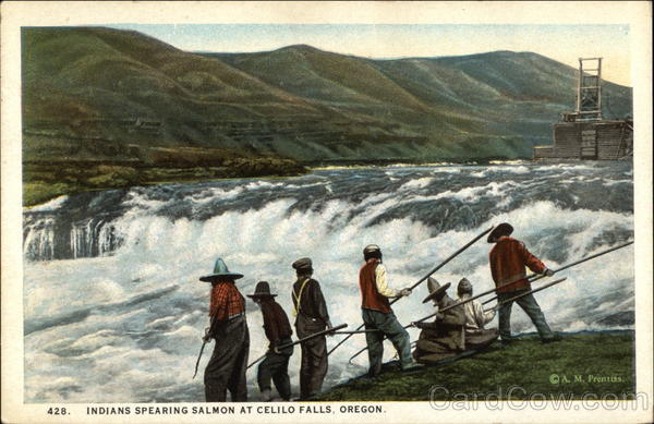 Front: 428. INDIANS SPEARING SALMON AT CELILO FALLS, OREGON. ⒸA. M. Prentiss. Back: Lipschuetz & Katz PORTLAND, OREGON CHIES 200 A-101275. DOMESTIG TWO CENTS