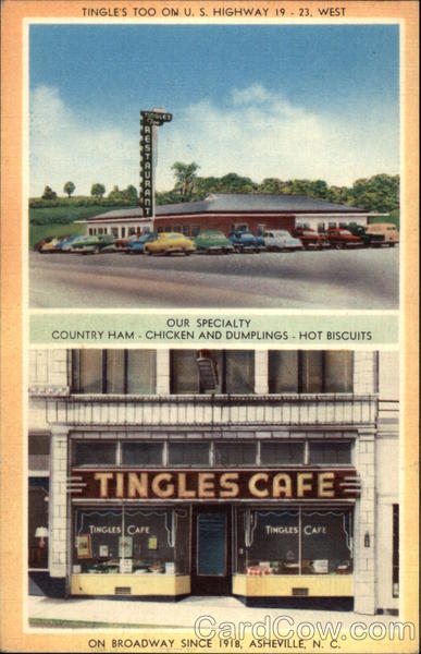 Front: TINGLE'S T0O ON U. S. HIGHWAY 19 - 23, WEST TINGLES OUR SPECIALTY COUNTRY HAM CHICKEN AND DUMPLINGS HOT BISCUITS TINGLES CAFE TINGLES CAFE TINGLES CAFE ON BROADWAY SINCE 1918, ASHEVILLE, N. C. RESTAURAAT Back: 18,896 F